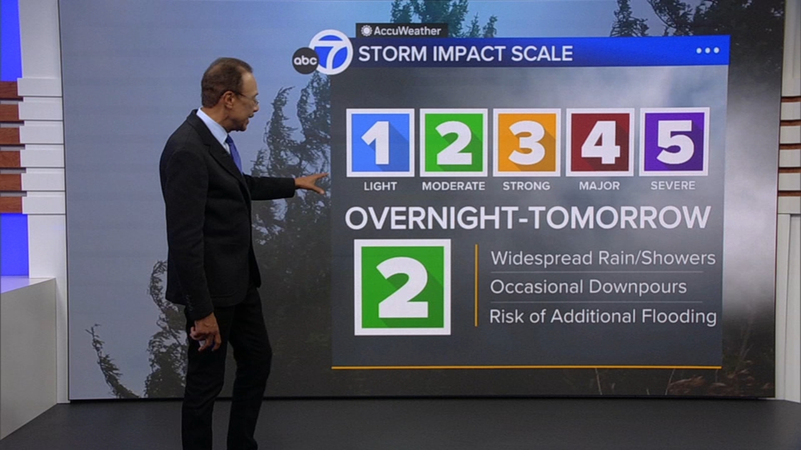 A Look AheadOur next round of rainfall will begin right around or just after midnight tonight. This will be a Level 2 storm on the exclusive ABC7 Storm Impact Scale, and it will bring moderate rainfall and downpours through the morning hours tomorrow. This system will likely weaken just a bit in the mid-to-late morning before intensifying once again in the afternoon.